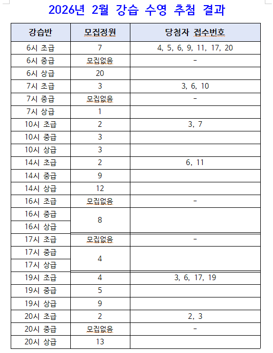 *당첨자는 강습 등록 시 배부한 접수증을 지참하여 1월 22일 ~ 1월 29일 기간 안에 방문 결제하여 주시기 바랍니다. (미결제 시 당첨 무효)