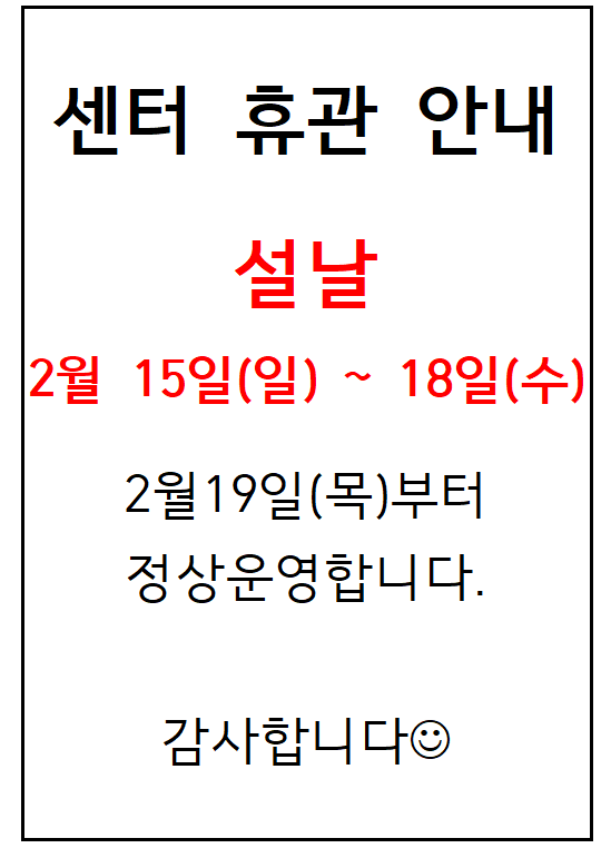 설날 연휴 휴관일 안내 페이지 정보 작성자 관리자 작성일26-02-01 05:33 조회1,100회 관련링크 이전글 다음글 목록 본문 문의 : 033-436-7330 이전글 다음글 목록