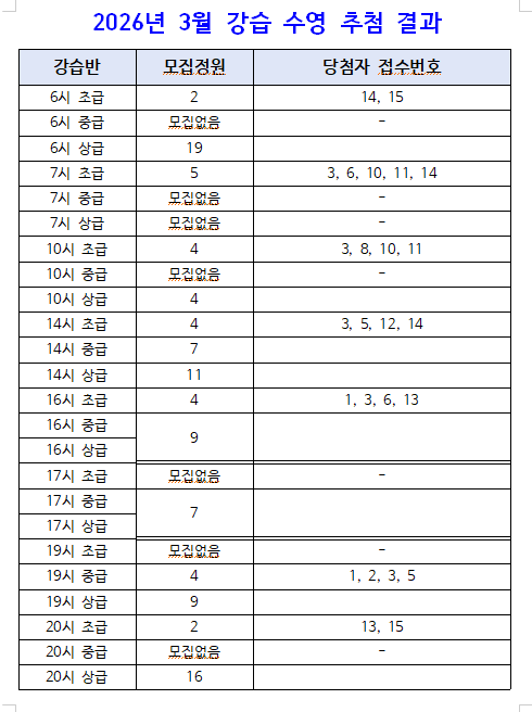 *당첨자는 강습 등록 시 배부한 접수증을 지참하여 2월 22일 ~ 2월 28일 기간 안에 방문 결제하여 주시기 바랍니다. (미결제 시 당첨 무효)