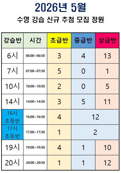 5월 수영강습 신규 접수 기간 : 4월 18일 ~ 4월 21일 (20시까지 방문 접수)