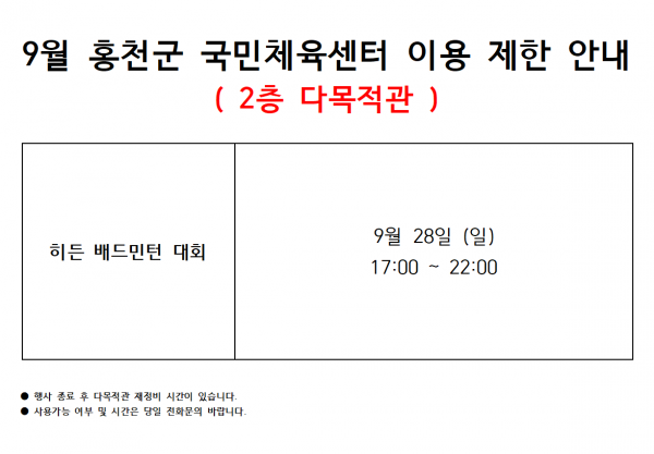2025년 9월 다목적 체육관 이용안내 (9/26수정) 페이지 정보 작성자 관리자 작성일25-09-02 14:03 조회780회 관련링크 이전글 다음글 목록 본문 문의 : 033-436-7330 이전글 다음글 목록