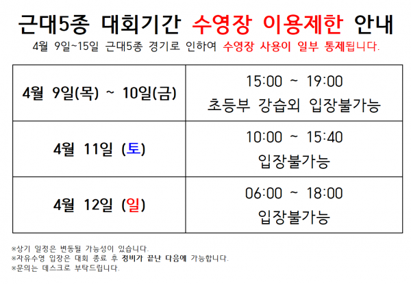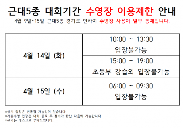 2026년 4월 근대5종 수영장 이용안내 페이지 정보 작성자 관리자 작성일26-03-31 10:19 조회47회 관련링크 다음글 목록 본문 ※자유수영 및 강습 입장은 대회 종료 후 정비가 끝난 다음에 가능합니다. ※문의는 데스크로 부탁드립니다. 다음글 목록