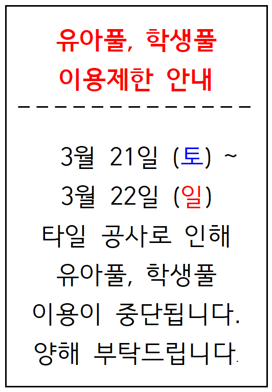 유아풀 학생풀 이용 제한 안내 페이지 정보 작성자 관리자 작성일26-03-20 16:03 조회125회 관련링크 이전글 다음글 목록 본문 문의 : 033-436-7330 이전글 다음글 목록