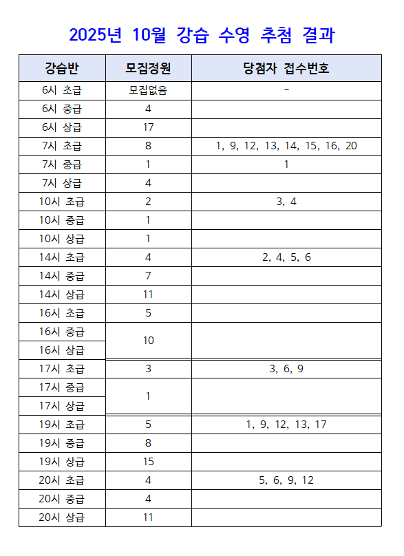2025년 10월 수영강습 추첨 결과