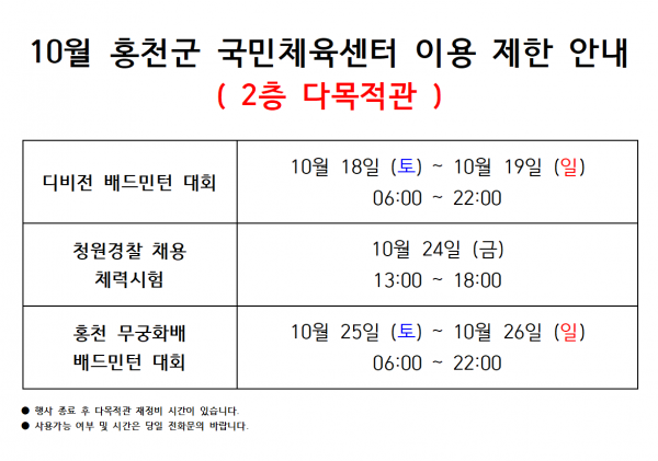 2025년 10월 다목적 체육관 이용안내 (10/17 수정) 페이지 정보 작성자 관리자 작성일25-10-01 15:44 조회473회 관련링크 이전글 다음글 목록 본문 문의 : 033-436-7330 이전글 다음글 목록