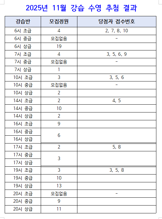 *당첨자는 강습 등록 시 배부한 접수증을 지참하여 10월 22일 ~ 10월 29일 기간 안에 방문 결제하여 주시기 바랍니다. (미결제 시 당첨 무효)